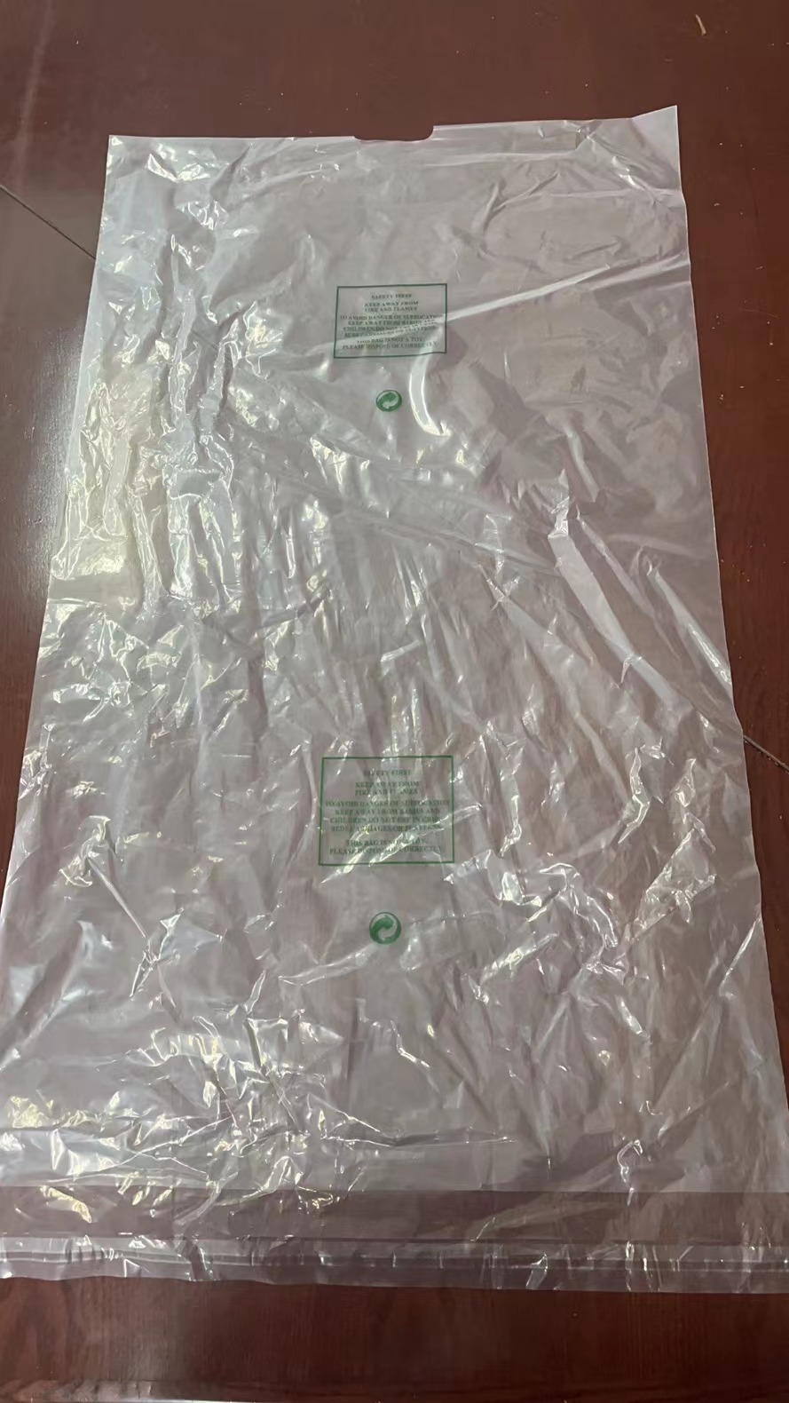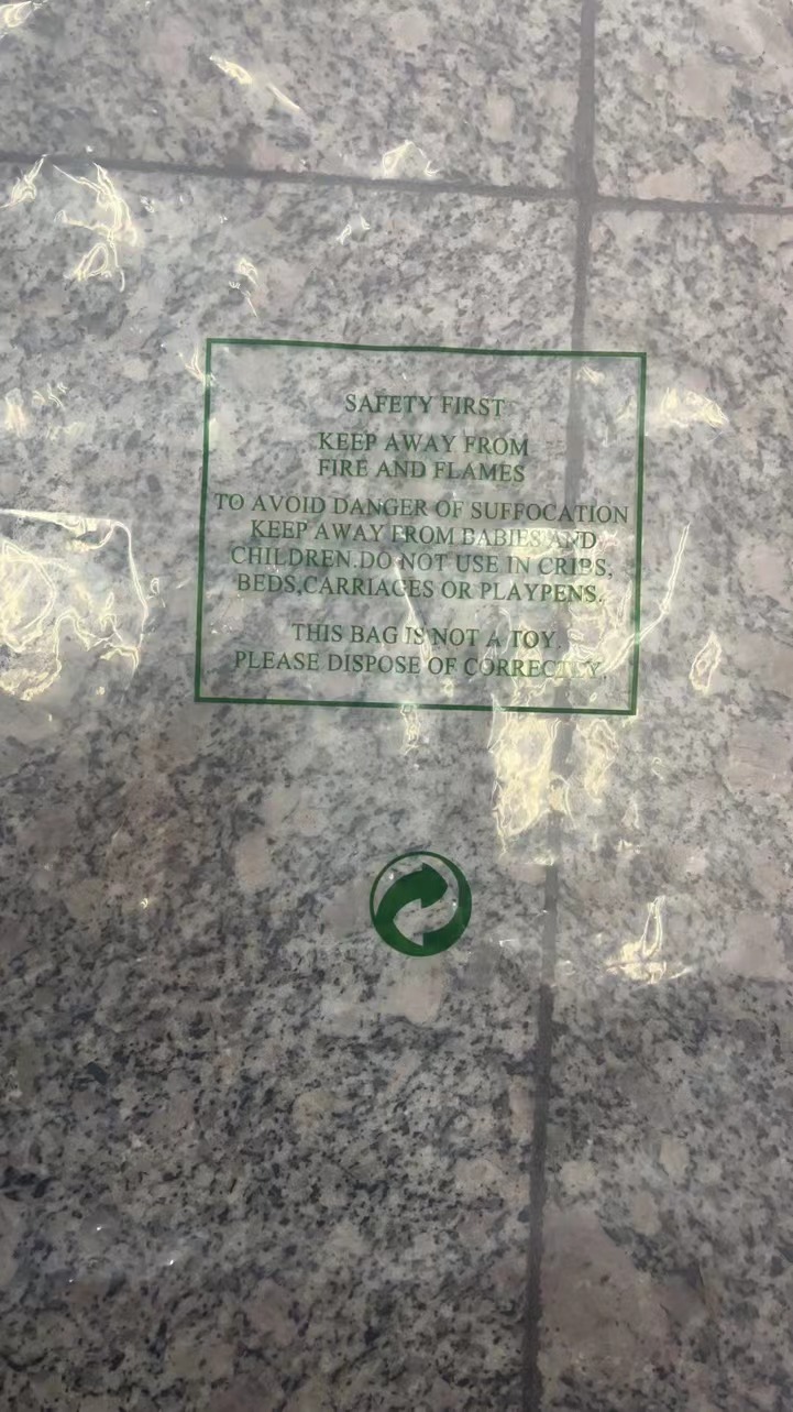 {"材质":"聚乙烯纯原料","外观":"平肩自封口","印刷":"有","长度":"840mm±5mm","宽度":"490mm±2mm","厚度":"单边≥5丝","自封口距离":"35mm","使用寿命":"包装类易耗品天","计量单位":"ITE","参照标准":"GB/T 4456","备注":"1、质量要求:自封口宽度5.0cm,印刷字迹清晰,拼写正确,无油墨污染;袋体平整,抗静电,有韧性,透明度好;热封部位牢固,折边结实,袋内不能有杂质粉末污染衣服,袋口不粘连,易分离;无异常气味.\n2、包装运输;包装清洁无污染,运输工具清洁,干燥,内外包装无损坏,无脏污.\n3、验收:允差内的接收使用;超出允差范围降等接收使用造成损失的,供应商赔偿差额;不能使用的退换货,产生的一切费用由供应商承担."}